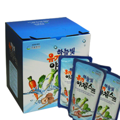 물품특징 야채스프는 죽이 아니라 야채 달인 물입니다. 일본의 생물학 박사인 다테이시 가즈씨가 30년 평생에 걸쳐 연구 개발한 대체식품 요법입니다. 시중 책방에서 "야채스프 건강법" 이란 번역서로 소개되어 있습니다. 야채스프의 재료는 우리주변에서 쉽게 접할 수 있는 야채로서 우엉, 당근, 무청, 무, 표고버섯 이 5가지 재료에서 추출하여 만들기 때문에 부담이 없으며, 사람의 몸에 필요한 영양분이 듬뿍 들어있습니다. 집에서도 쉽게 만들어 드실 수 있습니다.